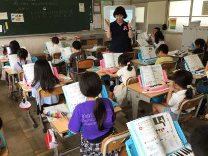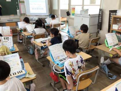 「2びょうし 3びょうしのちがいをききとろう」をめあてに、鍵盤ハーモニカの練習をします。児童たちは、先生の手拍子に合わせて演奏しています。
