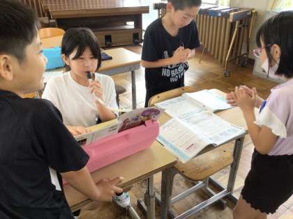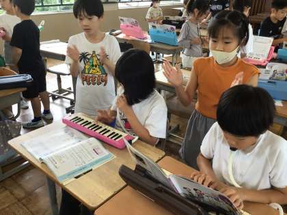 鍵盤ハーモニカの演奏に合わせて手拍子を打ち、リズムアンサンブルの練習をしています。手のひらも立派な楽器ですね。