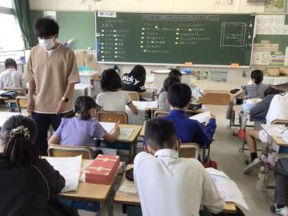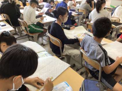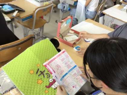 布製品づくりの授業が始まりました。黒板には「目的に合った布製品を作るために必要なポイントを考えよう」という課題で、児童たちが意見を出し合った跡がありました。布製品を快適に使うためのポイントが、さまざまな視点から出されていました。