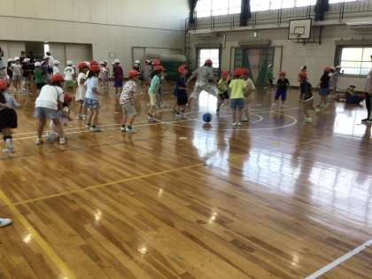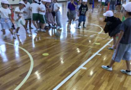 体育委員会企画のドッジボールです。低学年は、転がしドッジボールせす。丸いコートで楽しみました。終わりの時間になると、「もう、終わり?」「もっと、やりた」という声が聞かれました、