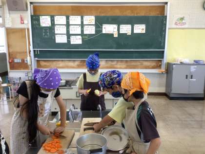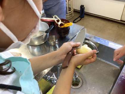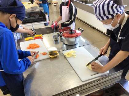 カレー作りをしています。班で役割分担をして、食材を切っています。ジャガイモの芽もしっかりととっていました。
