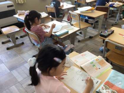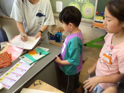 休みの日にしていることを短い文でいくつか書き、説明する順序を考えています。できた児童から、先生にできた文を見せに行きました、先生は、できた文の良いところや改善するとよいところを個別に伝えています。