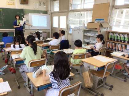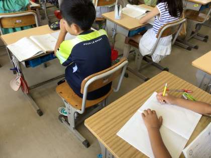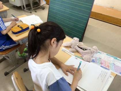 ローマ字を学習しています。「子音」を学ぶと、「子」とう時から「母音」につなげて学習が進んでいきました。母音と子音の組み合わせで、50音が書けることも学びました。写真下の線が入った黒板は、ローマ字用の黒板です。