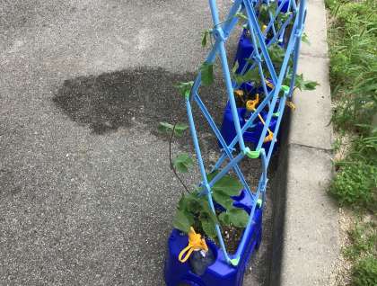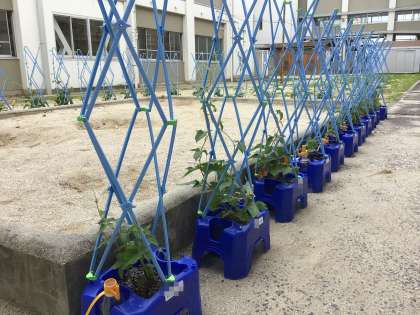 先週は暑い日が続きましたが、児童たちが水やりの世話をしっかりとおこないました。今はアサガオのつるものび、支柱を立てて育てています。