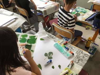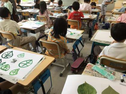 「葉っぱミュージアムをつくろう」の学習です。お気に入りの実物の葉を選んで、画用紙に描きます。絵の具を混ぜて、お気に入りの葉っぱと同じ色になるように色づくりを工夫しています。