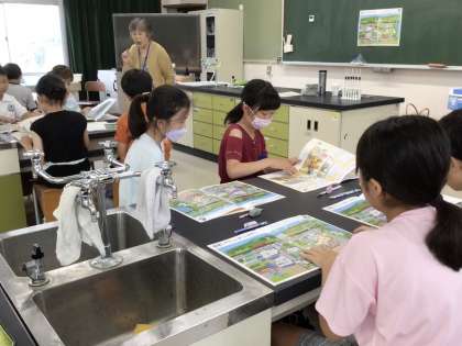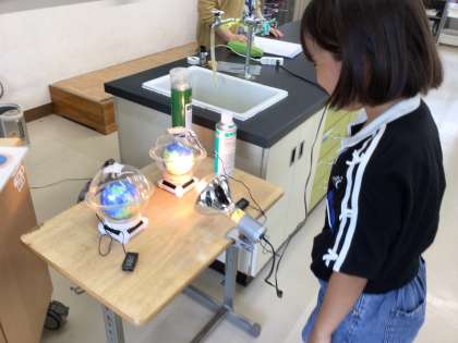 愛知県地球温暖化防止活動推進員の方をお招きして、地球温暖化とその防止について学びました。モデルを使った演示実験(写真中)や、海面上昇を体験する実験(写真下)など、実験を交えたお話で、温暖化の影響を実感しました。温暖化防止のために、自分たちができることを考え、実行していきたいです。