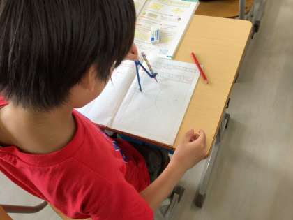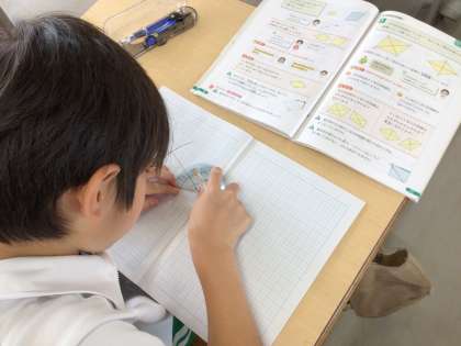 平行四辺形の特徴を学んでいます。コンパスを使って図を描いたり、分度器で角度を計って、法則を見つけています。
