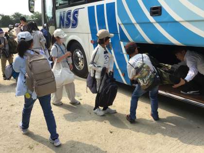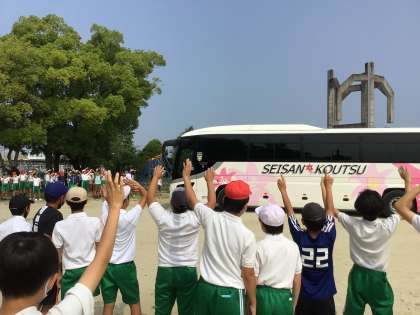 6年生が見送る中、バスは六所山に向かって出発しました。