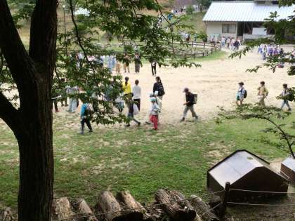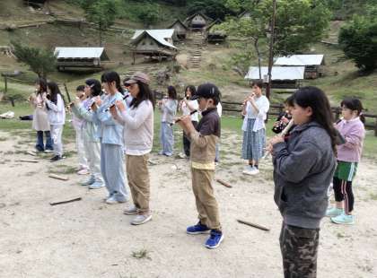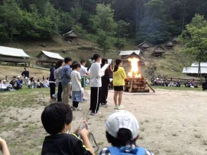キャンプファイヤー。リコーダー隊の演奏で、ファミリー広場に集いました。火の使いの点火でキャンプファイヤーのスタートです。
