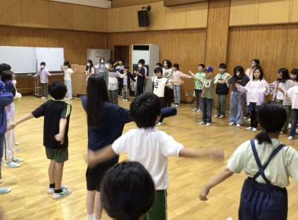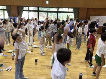 ラジオ体操で体をほぐします。前に出ているには保健係です。