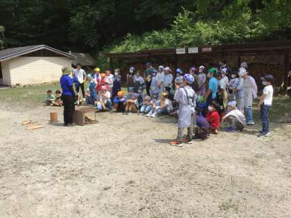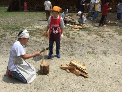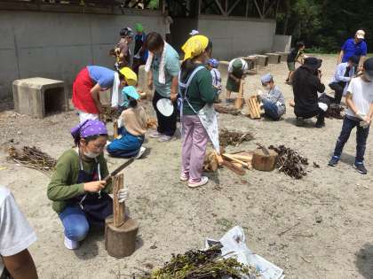 火起こし体験のために、かまど担当の児童が薪の準備をしています。