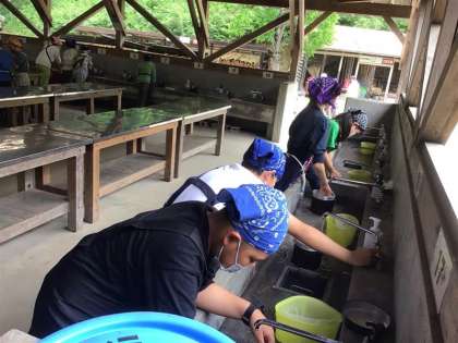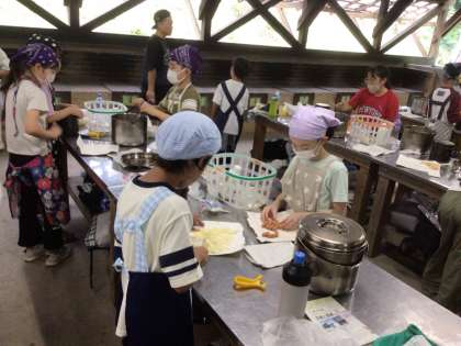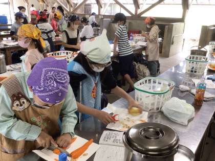 炊事場では、炊飯の準備とカレーの食材の仕込みをしています。家庭科での学習が生かされています。