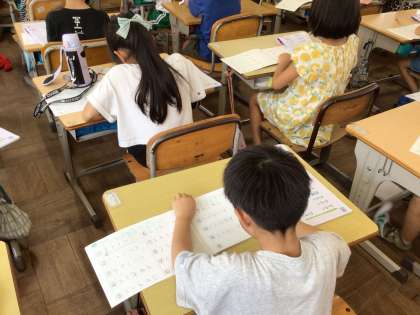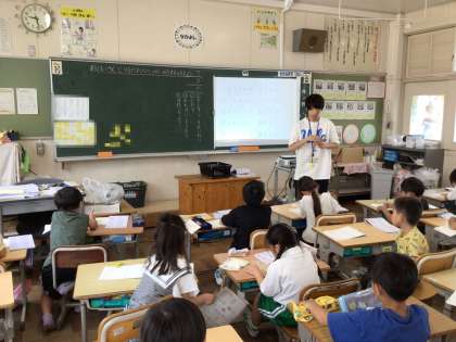 計算ドリルノートの使い方を確認しています。実物のノートをプロジェクターで拡大して写し、児童が分かりやすいように説明をしています。