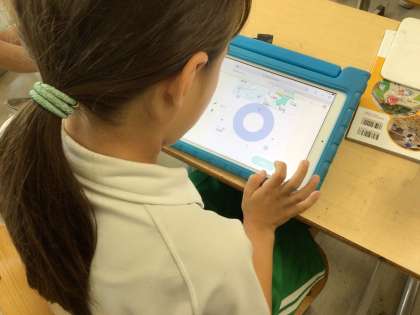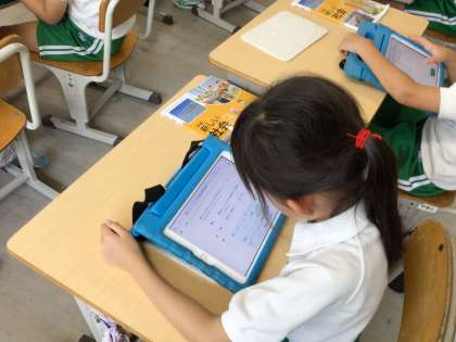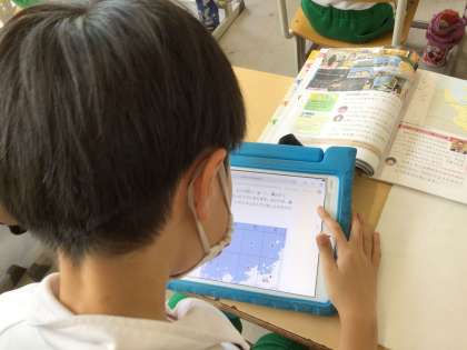 「市のようす」を学び、学習用タブレットのアプリで復習をしています。間違えた問題が再度出題されるAIドリルなので、児童の理解度に合わせた学習を進めることができます。