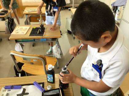 「左右」の文字を練習し、片付けをしています。次に使うときのことを考え、筆の手入れをしっかりとしています。物を大切に使う心も育ちます。