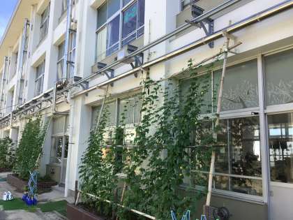 梅雨明けしてから雨の日が少なくなりましたが、ツルレイシの水やりをしっかりと続け、立派な実がなりました。1年生の教室には、緑のカーテンができました。