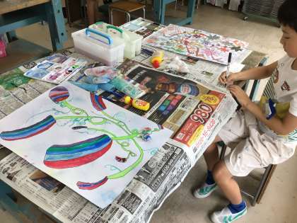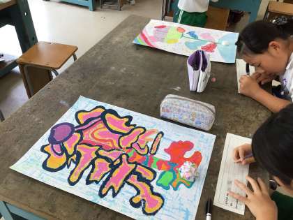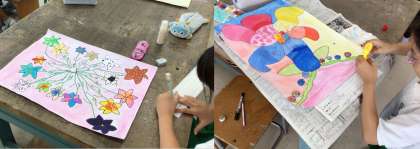 「ばぼろしの花」の作品が完成しました。花のたねも形や色を工夫して作りました。画用紙いっぱいにまぼろしの花が咲きました。