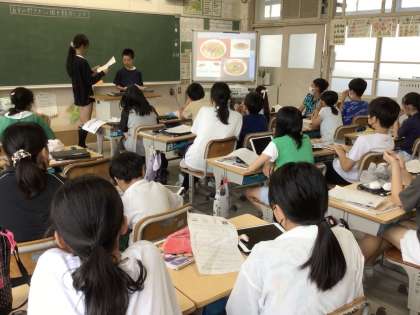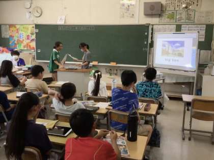英語で自分の行きたい国を紹介し、それを聞いて英語で感想を答えるペアでの発表です。有名な建物に、It's big、、好きな料理の紹介に、Me too.など、さまざまな会話が聞かれました。