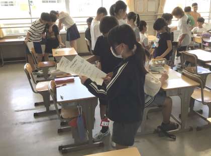 学活の時間に夏休みビンゴを行い、久しぶりに会った級友と会話する時間を楽しんでいる学級もありました。