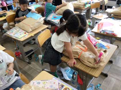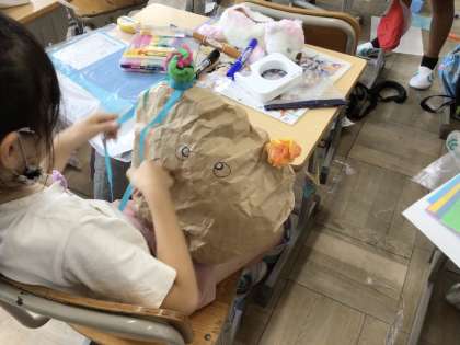 「くしゃ くしゃ ぎゅっ」の作品づくりです。紙袋をくしゃくしゃにして、ふくらませて、ぎゅっとして、動物や魚を作りました。くしゃくしゃにしたり、ぎゅっとしたりする感触を味わいながら、楽しく作品づくりをしました。