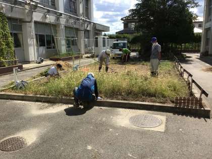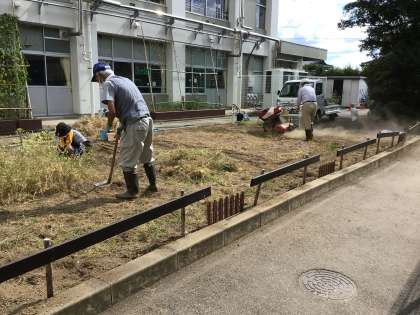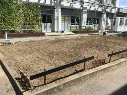 1年生の教室と理科室の間の中庭の花壇では、枯れた花や雑草をとって整備をしていただきました。今後は、春に向けて新しい花の苗を植えていきます。