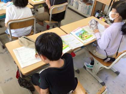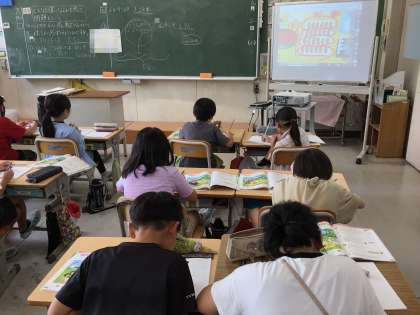 「どんな計算になるのかな」の学習です。キャンプでバーベキューをしている絵をもとにした問題を解いています。トマトは一人いくつ食べられるか、ならべて置いてあるウインナーの数は何本かなど、今までに学習した四則計算のうち、何算を使って答えを出すかを考えました。児童が書いた授業の振り返りを読むと、「わり算は、同じ数に分けるときに使う、かけ算は全部でいくつあるかのときに使うことが分かりました」と、問題の意味を把握しながら式を立てて答えを出すことができていることが伝わってきました。給食で、おかずを分けるときなどにも使えそうです。