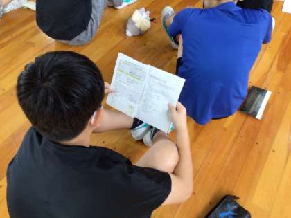 修学旅行に向けて、体育館で学年集会を行っています。しおりで活動を確認したり、係ごとに集まって仕事内容を確認したりしました。