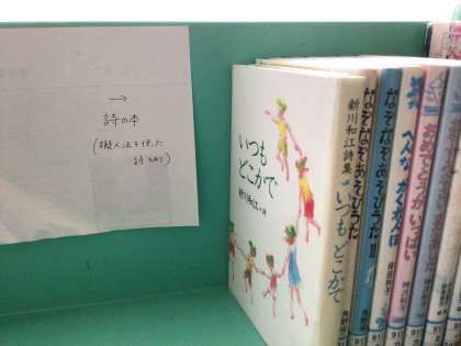 木曜日は学校司書さんが来てくださり、図書室の本の整備や授業で使う本の選定をしてくださっています。今日は、3年生の廊下に国語の時間に学習する詩に関する本が集められたブックトラックを用意していただきました。
