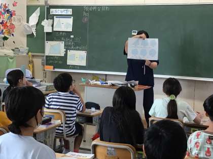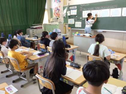 「多角形の内角の和を考えよう」という学習課題での授業です。三角形の内角の和は180度であるという前回の授業で学んだことを生かして、四角形、五角形、六角形、七角形、八角形までグループで考えました。多角形を細かく分けながら、様々な方法で内角の和が求められることが分かりました。中には、規則性を発見したグループもありました。答えは一つでも、考え方はさまざまで課題解決の多様な手段を見つけることができた授業でした。