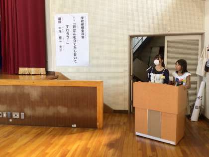 良い姿勢で生活する方法について学び、姿勢エクササイズに取り組む機会として、全校で学校保健委員会を行いました。テーマは、「骨ばんを立てた姿勢ですわろう」です。