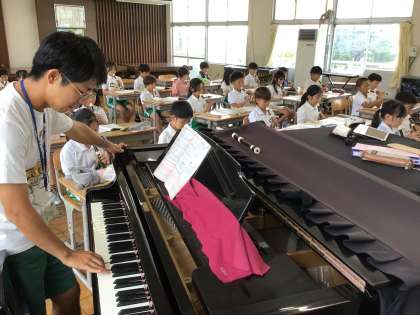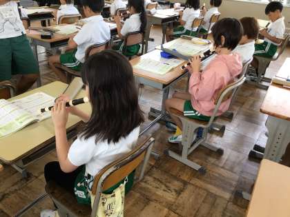 リコーダーの授業です。担任の先生がピアノで弾く主旋律に合わせて、児童たちは2拍子のリコーダーパートを演奏していました。リコーダーの指使いにもだんだん慣れてきました。