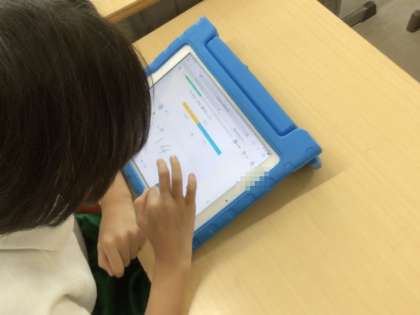 学習用タブレットのAIドリルで問題を解いて復習しています。間違えた問題は、繰り返し出題されます。児童たちは、正答率を上げようと集中して取り組んでいました。
