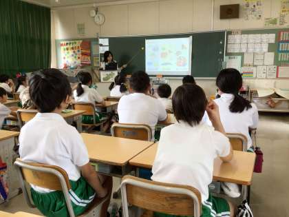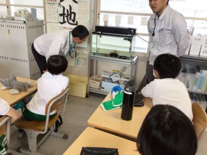 「ビオめだかプロジェクト」に参加している5年生が、講師の方から生物多様性や自然環境の保全について学びました。メダカに関係する質問も児童からたくさん出ました。教室で育てているメダカの健康状態をみてもらった学級もありました。10月には、ビオトープの見学に行きます。次回も、よろしくお願いします。