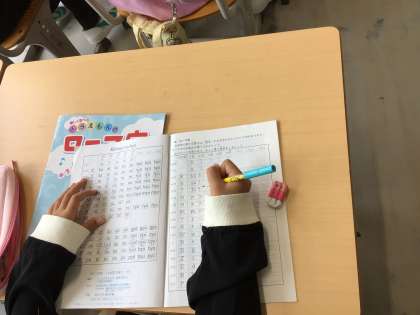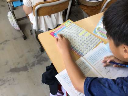 ローマ字を学習しています。ローマ字表を見ながら、一文字ずつ、読み方を調べていました。意味が通じない言葉になった児童は、もう一度、考え直していました。「takemura」も読めるようになります。