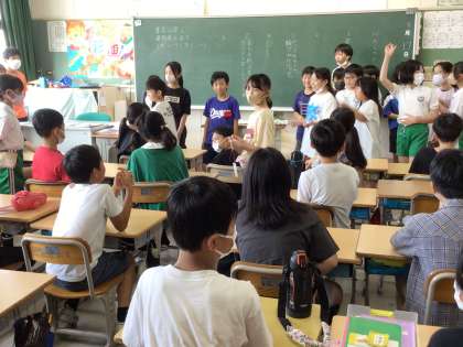 5年生がなかよし活動で同じ班の6年生の教室へ、修学旅行のお守りを届けに行きました。