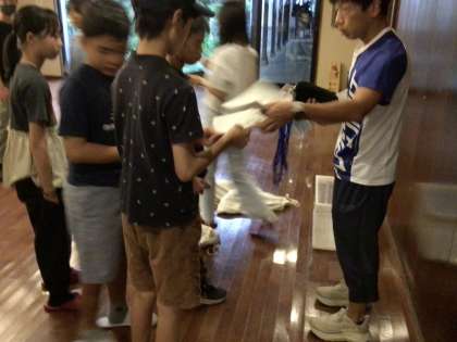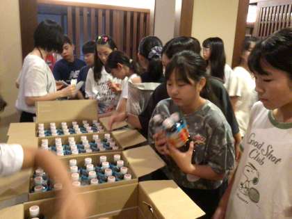 班長は貴重品を、食事係はお茶を班員に配ります。朝の健康観察では、全員元気です。今日の旅行も楽しみです。
