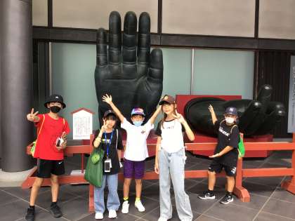 実物の大仏様の手のひらの前で。(写真上)
