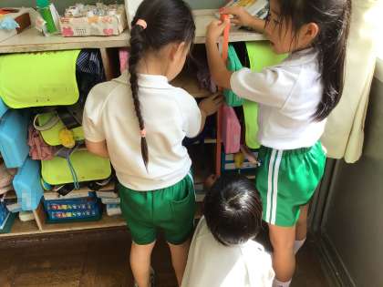 「おおきさくらべ」の学習です。紙テープを使って、グループで協力して、机・教卓・ロッカーの高さを調べています。この後、紙テープの長さから、高さを比べました。