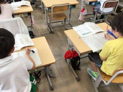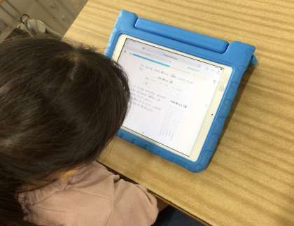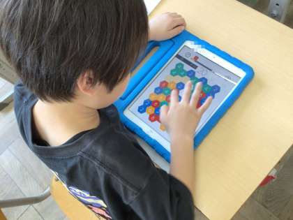 たし算やひき算のひっ算の問題を解いています。繰り上がりや繰り下がりのある計算ができるようになるために練習問題で計算の技能を高めています。練習問題が終わった児童は、学習用タブレットの算数のアプリの問題に挑戦し、自分のペースで学習を進めています。