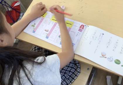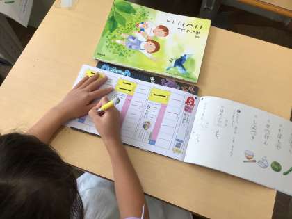 漢字ドリルを使って、漢数字を練習しています。同じ「一」でも、「一つ」や「一こ」では読み方が変わることを学びました。授業の終わりには列ごとに集めて、担任の先生が正しく書けているかどうかを確認します。