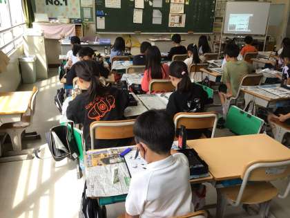 毛筆の授業です。授業の始めに基礎練習で、点と横画を書いています。力の入れ方を変えて、いろいろな太さの点と横画が書けるように練習していました。
