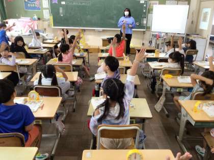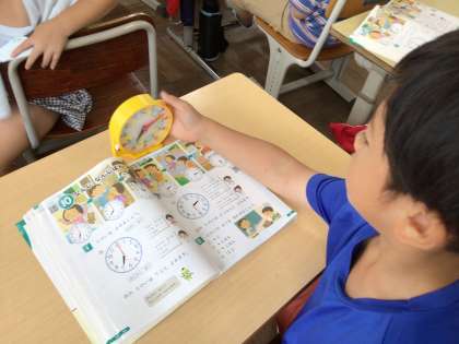 時計の読み方の学習です。最初は、「何時」「何時半」の時計の針が読めるようになることが目標です。教室の時計が読めるように学習を進めていきます。児童たちは、算数セットの時計の針を動かしながら、学んでいます。