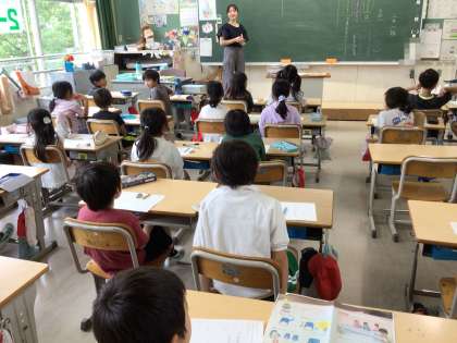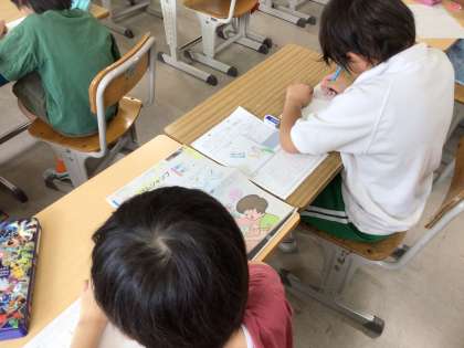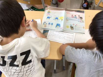 「おもちゃまつり」の学習です。どんなおもちゃを作るか、どのようにおもちゃの使い方を説明するかなどをペアで話し合っています。楽しいおもちゃ祭りになりそうです。