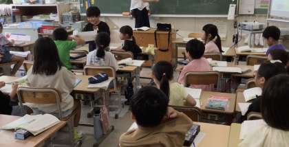 物語に出てくるネコとネズミの気持ちを考える授業です。一番前の席の児童は、みんなに聞こえやすいように後ろを向いて、意見を発表しています。聞いている児童も発表者に注目しています。発表する姿勢や聞く姿勢がしっかりできています。