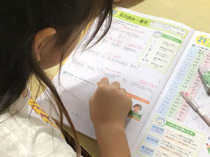 ローマ字の学習です。文章を読んだり、書いたりしています。例文に Mikan ga suki desu.などの文が出ています。