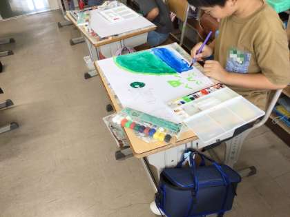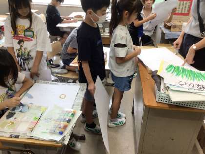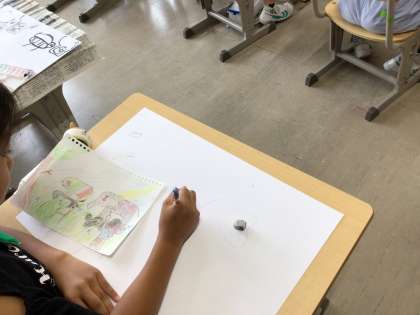 読書感想画の作品づくりです。児童たちは下書きを先生に見てもらい、良いところやどう描きたいかなどを伝えて、助言を聞いています。下絵が完成した児童から色ぬりを始めています。