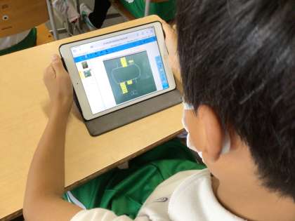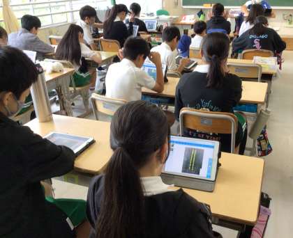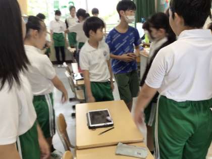 運動会のリレーのチームが決まり、学習用タブレットに配信された資料で確認しています。その後、チームごとに集まって走順を考えました。心を一つにして、がんばってください。