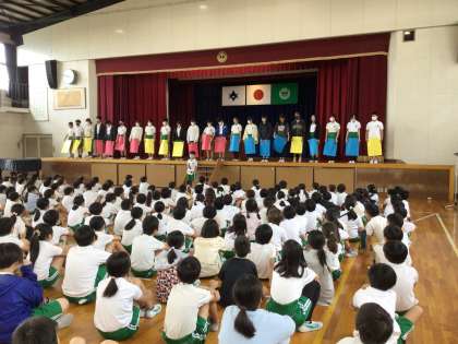 任命式に続いて、運動会のテーマが発表されました。各学級が考えたテーマをもとに、今年度のテーマが完成しました。