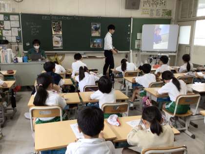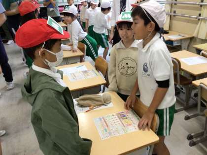 飲食店の工夫を考える授業です。映像や自分の体験から、どんな工夫があるかを考えました。その後、店員さんとお客さんに分かれて、接客の体験をしました。実際にやってみることで、お店の人の大変さや笑顔で接してもらうとうれしくなることなどを実感しました。