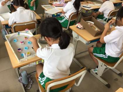 1年生と一緒に活動する「おもちゃ祭り」に向けて、遊び方の説明の練習をしています。自分たちが作ったおもちゃを見ながら、どう説明したらよくわかるかをグループで考えました。